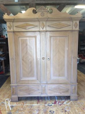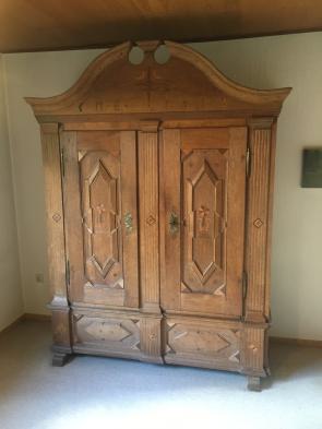 Schöner solider zweitüriger zerlegbarer Schrank mit originaler Krone. In situ erworben in Gelting/ Angeln.