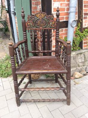 Schöner Original erhaltener Armlehnstuhl aus Friesland. Datiert 1840, Ulmenholz farbig gefasst. B: 58,5 cm, T: 42,5 , H:102,5 cm. Sitzhöhe: 47 cm