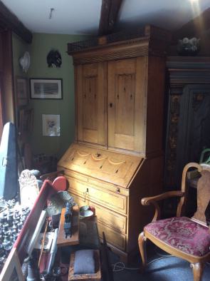 Es gibt einige Fehlteile in den umlaufenden Intarsienbändern. Einiges ist noch lose vorhanden. Insgesamt ein schönes seltenes norddeutsches Schreibmöbel.