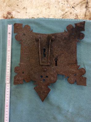 |  |  | Truhenschloss, Eisen kantengeschnitten, Nordfrankreich/ Belgien um 1650. Das Stück ist verrostet, jedoch funktionsfähig. H: 22,5 cm, B: 14,8 cm     Telefon : +(49) 4331 57673 Mobil:     +(49) 170 57 67 308eMail:     a.vollstedt(at)gmx.de