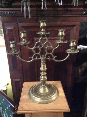 Fünfarmiger Messingleuchter, verschraubte Einzelteile: Tüllen, Teller, Leuchterarm, Schaft und Stand. 19.Jahrhundert,