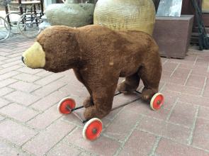 Brauner Steiff Bär auf Rollen. Stark abgeliebt - Brumm Funktion noch gut, Gestell mit Rädern Ok, L: 55 cm, B: 24 cm, H: 41 cm.