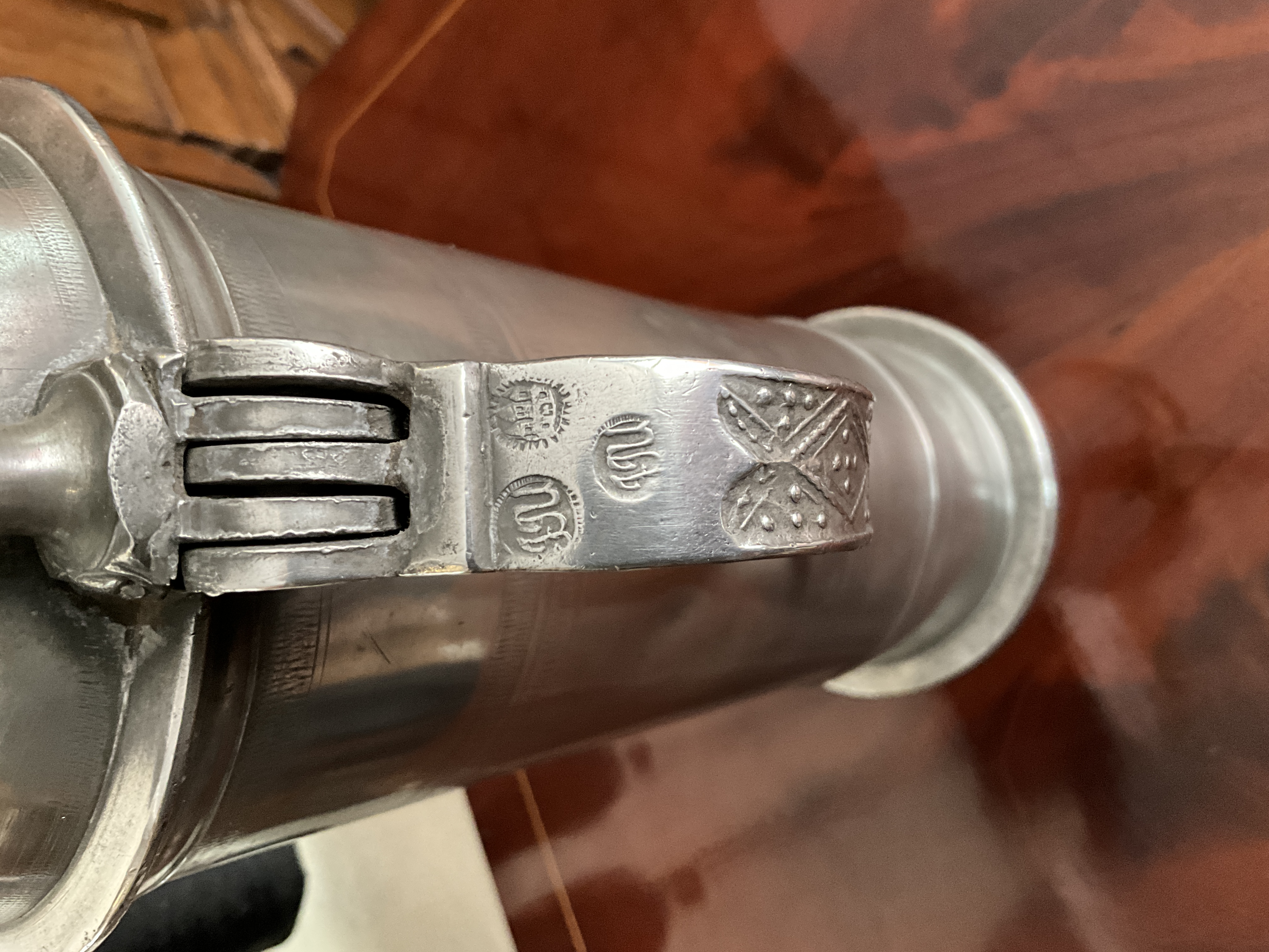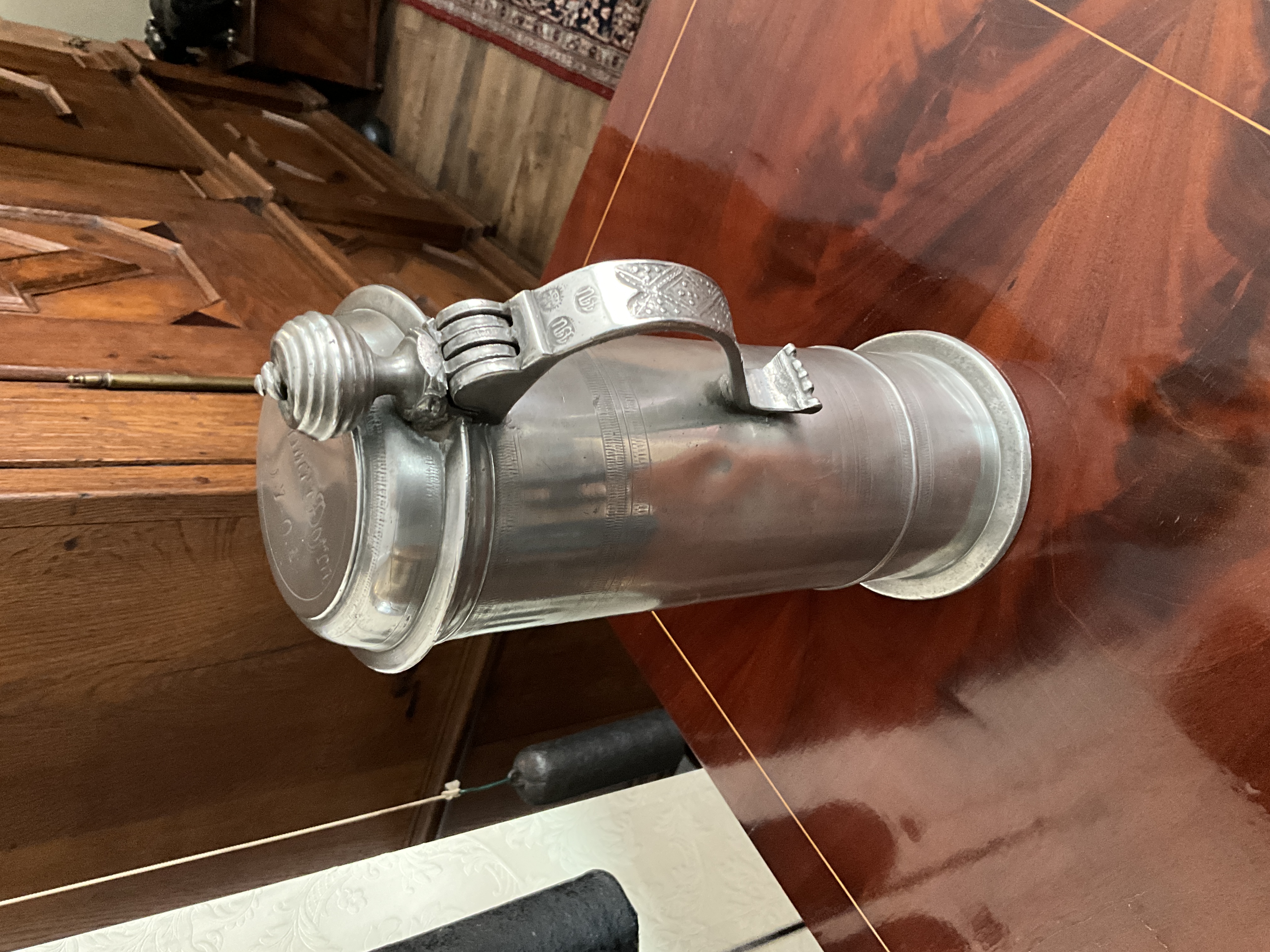 Großer Zinnkrug des Zinngießers Johann Joachim Ulrich aus Rendsburg.