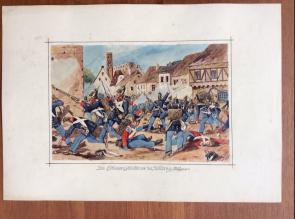 Detailreiche Darstellung der Schlacht bei Düppel aus dem deutsch/ dänischem Krieg 1864. Papier/ Karton etwas vergilbt, die Darstellung im guten Zustand.