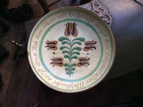 Typisches Dekor für Tellingstedt, hier jedoch in grün/ beige. Sinnspruch umlaufend.