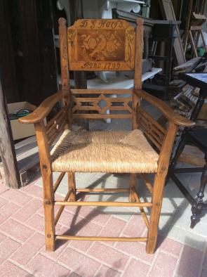 Armlehnstuhl aus den Vierlanden, datiert 1799, typische Gestaltung mit Marketerie auf dem Lehnenbrett. Vielleicht eine kleine Besonderheit: die „gitterartigen“ Füllstücke unterhalb der Armlehnen und des Lehnenbretts.