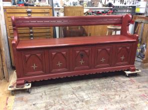 Große Truhenbank mit Ochsenblut roter Farbfassung, Klappdeckel mit Schloß, Schlüssel und Schloßbeschlag. Die Truhenfront ist in fünf Felder gegliedert, die Füllungen mit Sternen verziert und das verzierte Lehnenbrett bildet den oberen Abschluß.