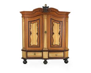 Zweitüriger Korpus, komplett zerlegbar, dreiteilige Gliederung der Front, kräftiges Gesims, selten schöne Schnitzereien mit jeweils einem Putto in Ranken aus Sonnenblumen und Bündeln von Maiskolben. Türen mit verkröpften Bastionsfüllungen - in den Ecken Sonnenblumen. Schloß und Schlüssel Original.