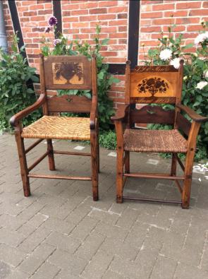 Typische Armlehnstühle mit intarsiertem Rückenbrett und originalen Sitzgeflechten. Gemischte Konstruktionshölzer - Rüster, Eiche und Buche.