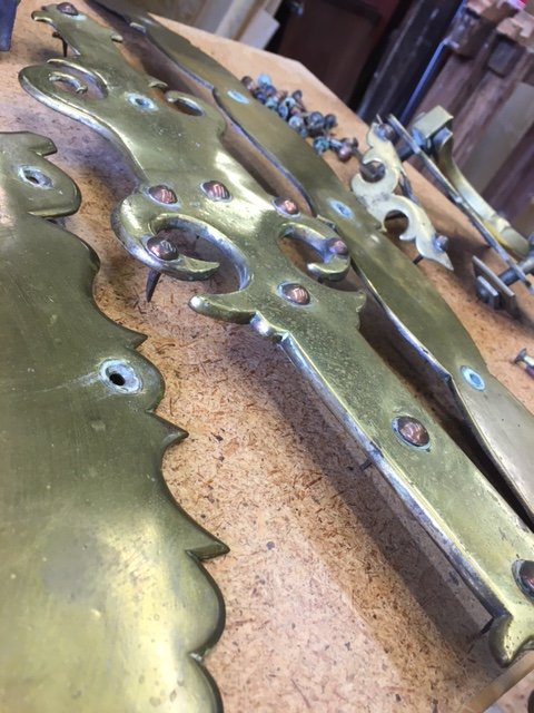 Ein kompletter Satz Truhenbeschläge aus schwerem Messing. Handhaben, Bänder, Schlossbeschlag, Schloss, Front und Deckelverzierungen. Komplett mit allen halbrunden Kugelkopfnägeln aus Messing.
