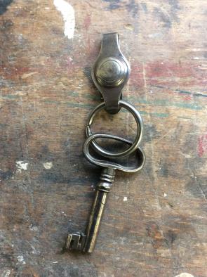 Kleiner Gürtelhaken aus poliertem Eisen, deutsch um 1800, mit Ring und kleinem barocken Schlüssel aus poliertem Eisen.